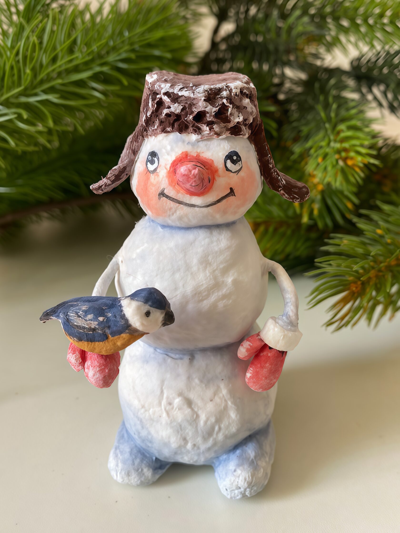 Снеговик с птичкой из ваты, 10 см — игрушка ручной работы.Милый снеговик с птичкой в руке — это воплощение зимнего уюта и доброй сказки. Выполненный вручную из натуральной ваты, он украшен тёплым шарфиком, морковным носиком и трогательной птичкой, которая словно прилетела отдохнуть . Высота игрушки — 10 см, что делает её идеальной для декора и подарков. Каждый снеговик уникален — создан с любовью и вниманием к деталям, он наполняет дом атмосферой праздника и тепла. Преимущества: