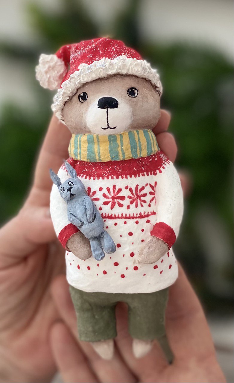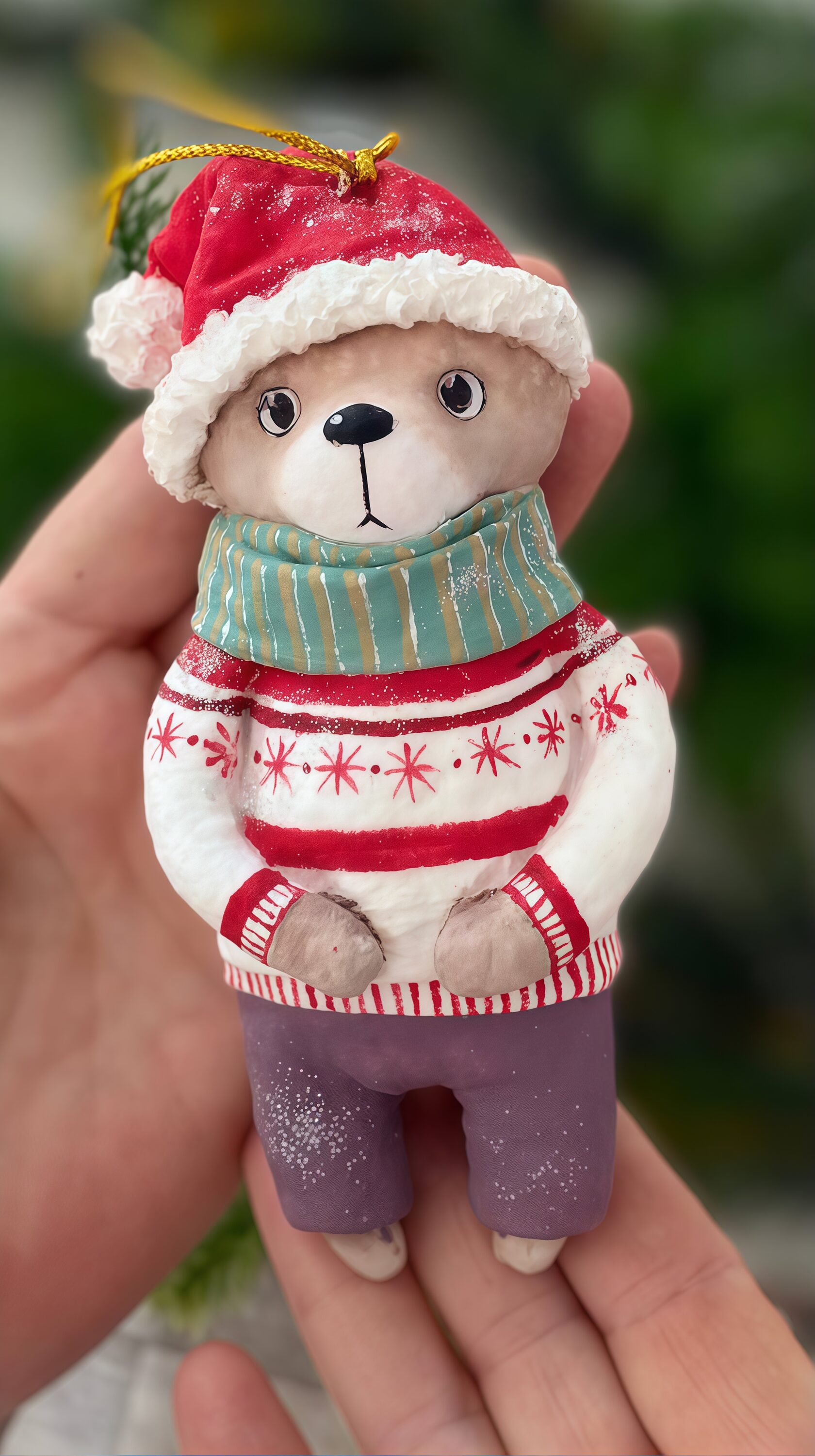 Мишка с подарком из ваты, 13 см — игрушка ручной работыОчаровательный мишка с подарком — это не просто игрушка, а символ праздника, уюта и добрых эмоций. Выполненный вручную из натуральной ваты, он бережно расписан и украшен миниатюрным подарочком, который он держит в лапках. Его высота — 13 см, а обаяние — безграничное! Такой мишка станет идеальным дополнением к новогоднему декору, душевным подарком или трогательной частью коллекции винтажных игрушек. Преимущества: