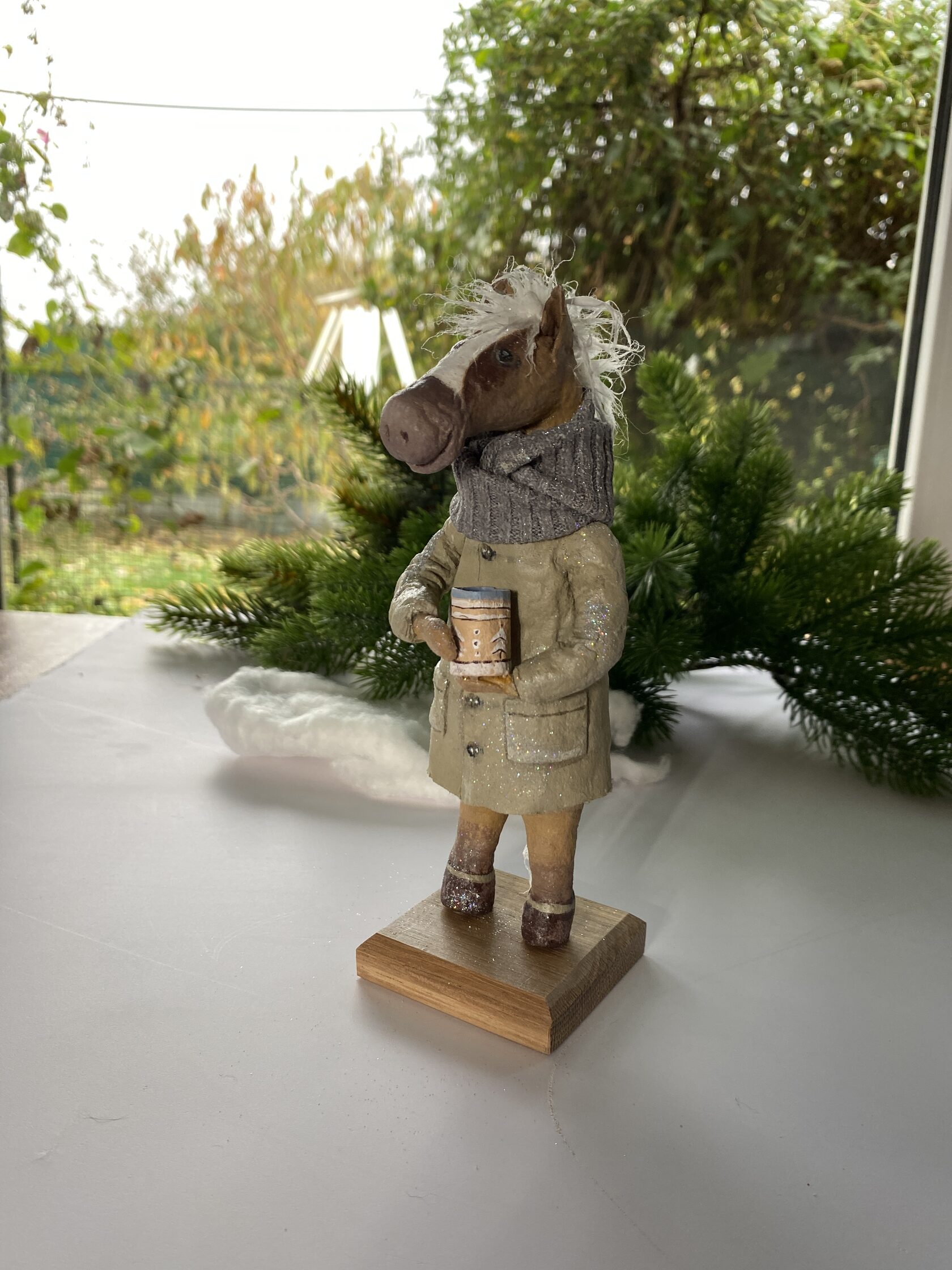 Ватная игрушка ручной работы «Лошадка на подставке с кружечкой чая» 🐴🍵 Лошадка на подставке с кружечкой чая — это уютная ватная игрушка, созданная вручную в винтажной технике. Она словно приглашает вас на чаепитие в зимний вечер, напоминая о тепле, домашнем комфорте и неспешных радостях жизни. Очаровательная лошадка стоит на аккуратной подставке, держа крошечную кружку чая — деталь, которая придаёт образу особую душевность. Каждая игрушка — уникальна, с любовью оформлена вручную, и несёт в себе тепло рук мастера. Характеристики: